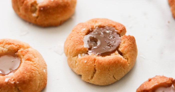 A fun take on a traditional dessert, these paleo and vegan salted caramel thumbprint cookies are a delicious holiday treat made with clean ingredients!