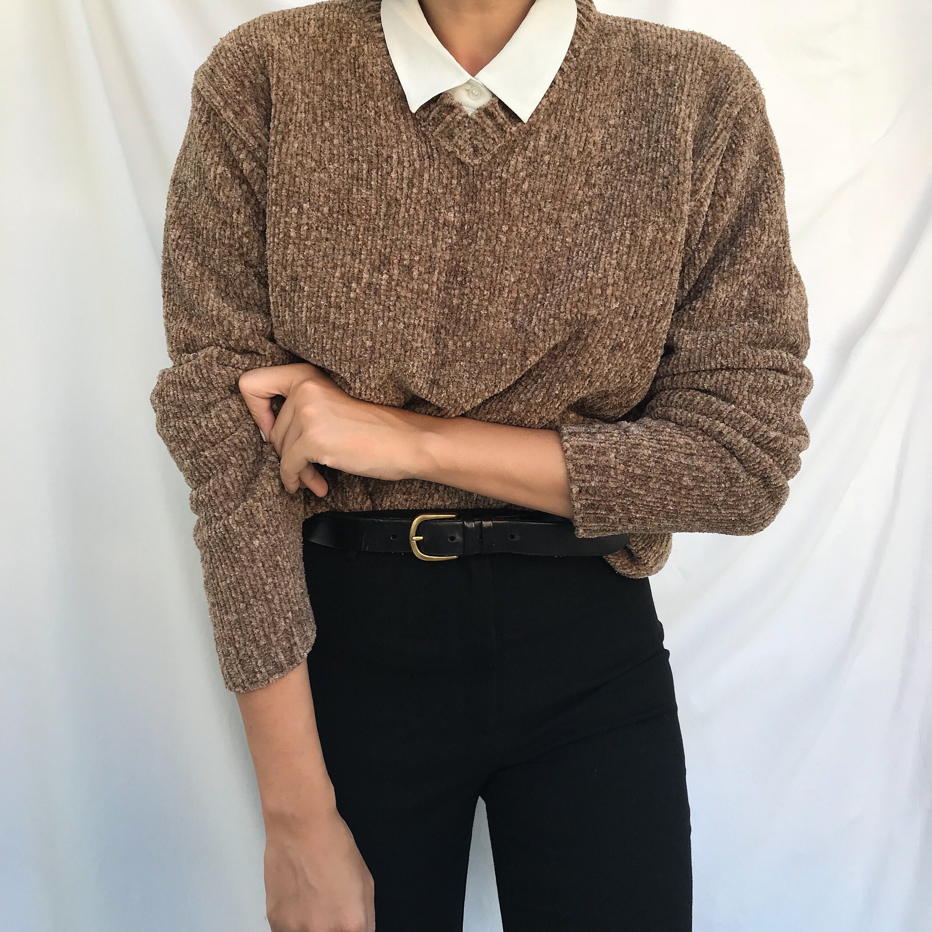 Chenille Sweater | â90s vintage taupe chenille sweater.No brand label.Size on label M, will fit S/M. The fit is oversized. Shown on a size S on the picture.Fabric is %85 acrylic %15 polyester.Coming from Paris!