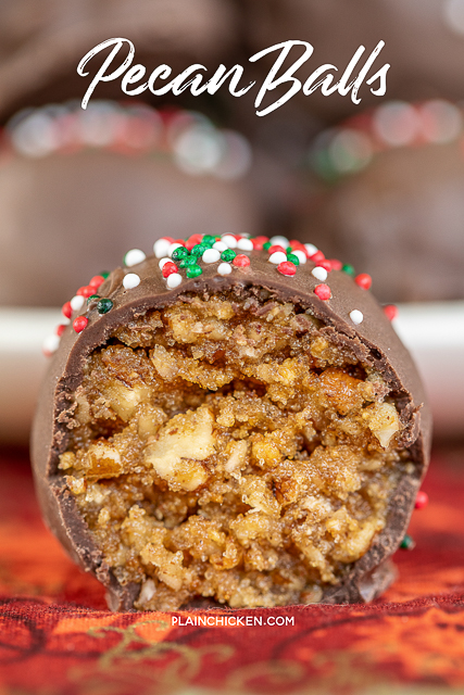 Pecan | Pecan Pie Balls – dangerously delicious!! I could eat the whole batch! Great for parties, tailgating and homemade gifts! Pecans, graham crackers, brown sugar, maple syrup, butter, vanilla and chocolate candy coating. Can add bourbon to the pecan mixture for a boozy treat. A MUST for your holiday cookie tray! #candy #pecans #dessert
