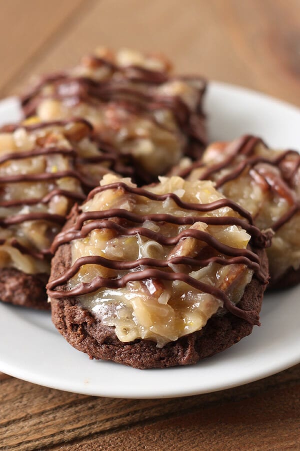 #German Chocolate | German Chocolate Cookies feature a homemade ultra soft, chewy, and gooey double chocolate cookie loaded with a flavorful coconut pecan topping. Amazing!